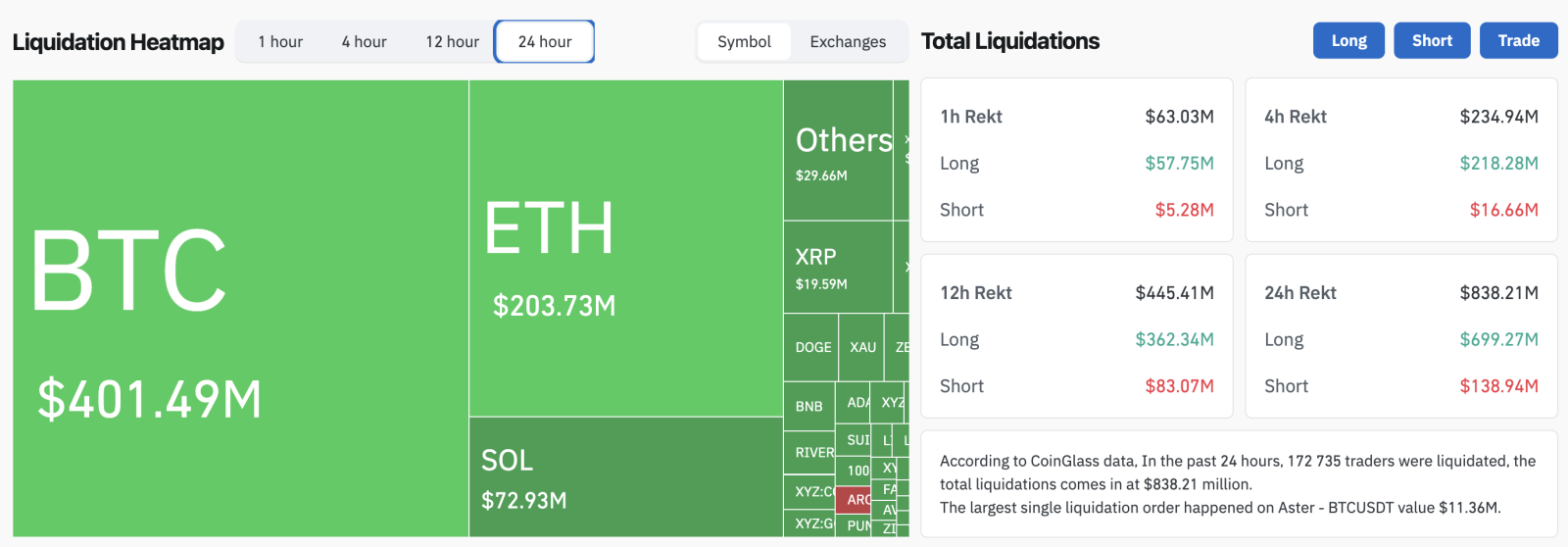 За даними CoinGlass, за добу обсяг ліквідацій на ринку ф’ючерсів становив $838 млн. Під примусове закриття позицій потрапили понад 172 тисяч трейдерів.