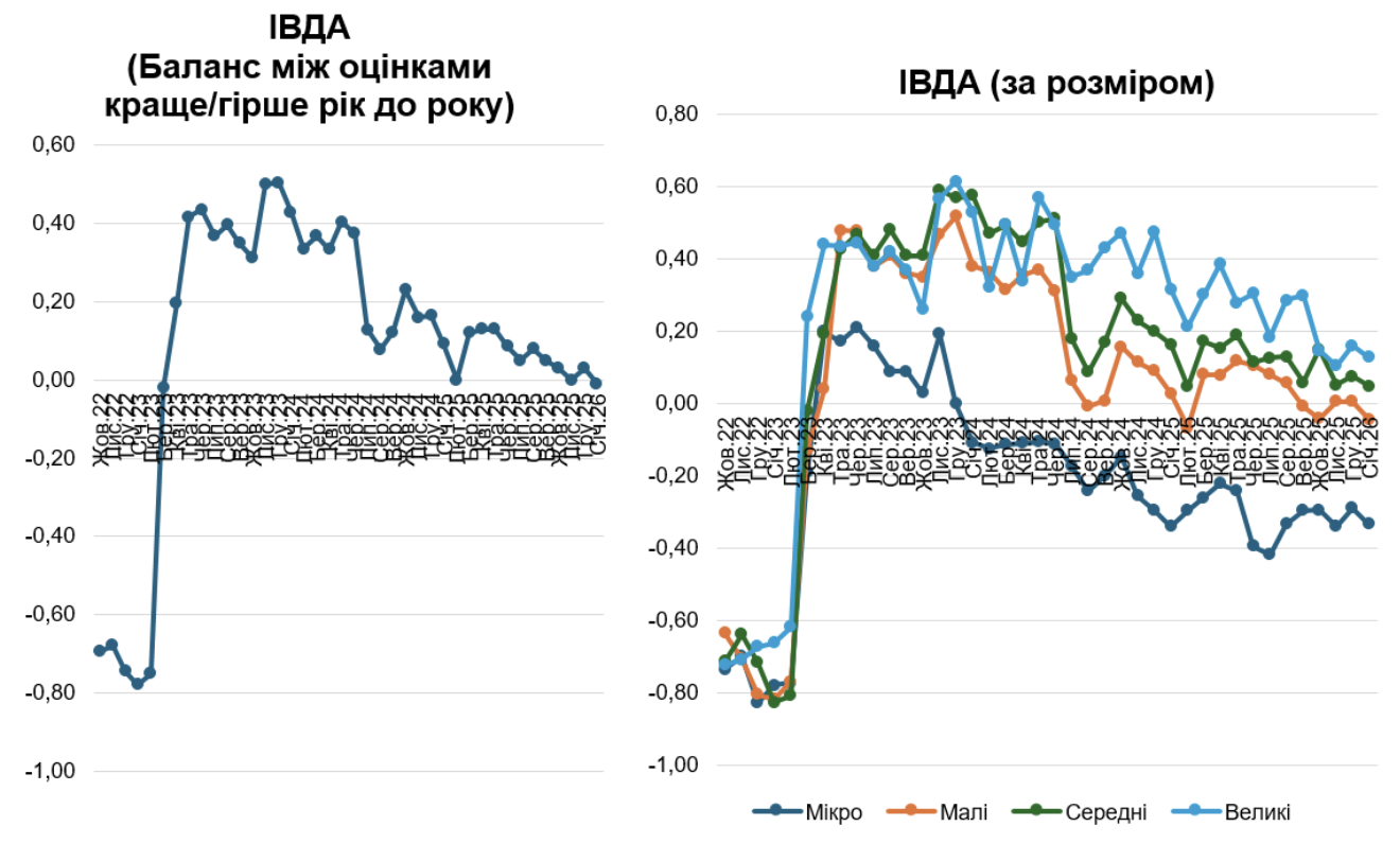 Індекс відновлення ділової активності (ІВДА) вперше з березня 2023 року має від'ємне значення — за місяць показник погіршився з 0,03 до -0,01. Значення індексу зменшилося для усіх груп підприємств, найнижчим та від'ємним він є для мікробізнесу.