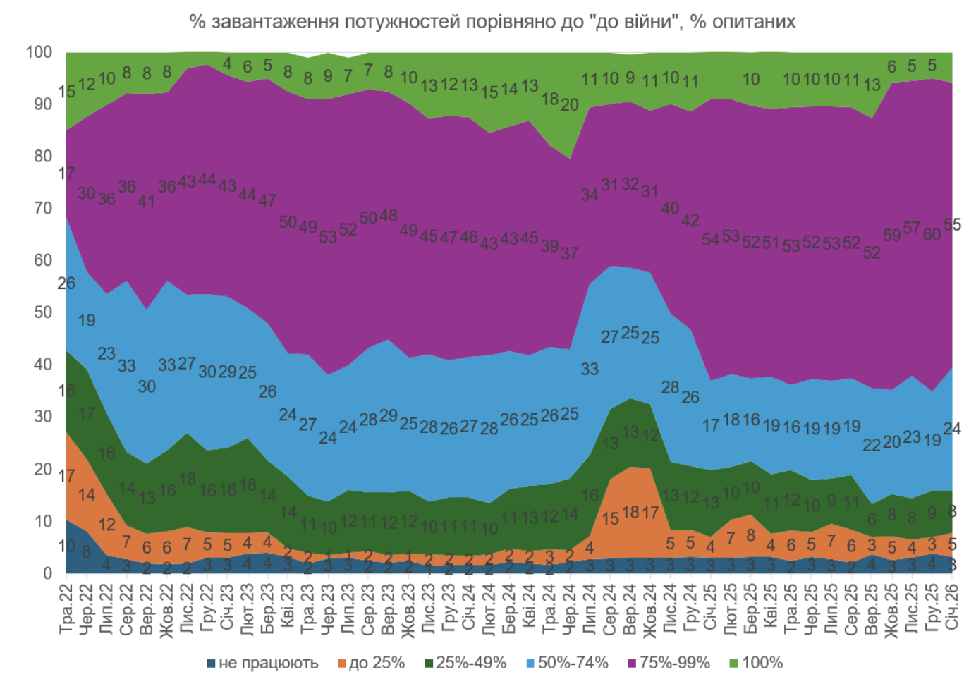 Завантаженість потужностей порівняно з «довоєнним часом» майже без змін. Частка підприємств, які працюють на повну потужність, зросла з 5% до 6%, а тих, хто працює із завантаженням 75−99%, зменшилася на 5 в.п. — до 55%. Це відбулося за рахунок ідентичного зростання частки компаній із завантаженням 50−74% — до 24%.