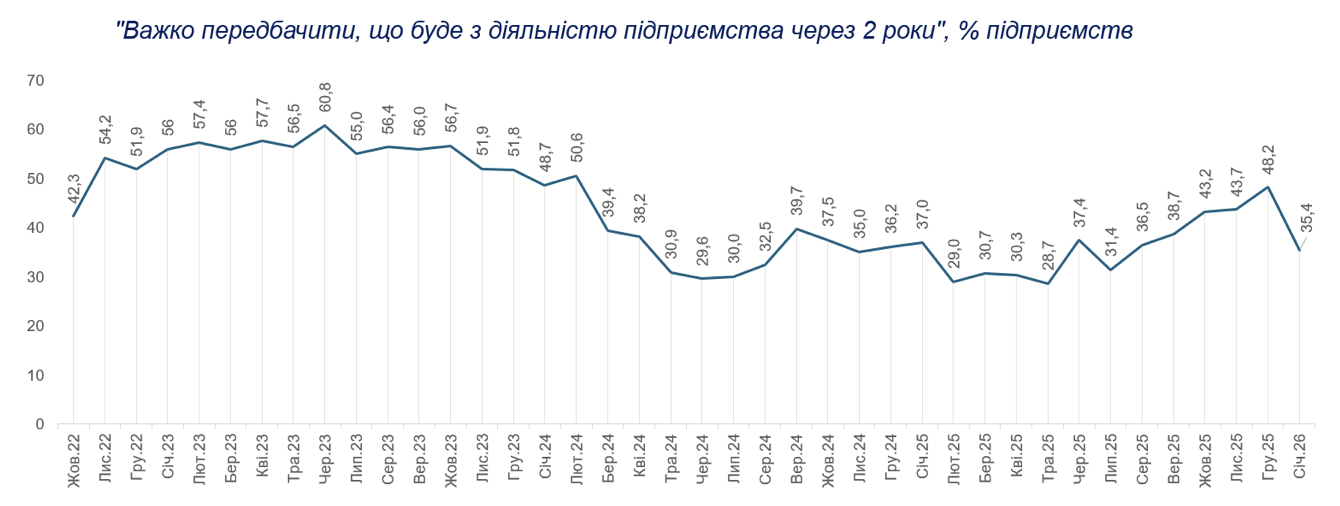 Довгострокова невизначеність знизилася з 48,2% до 35,4%. Найбільш суттєво ця невизначеність скоротилася для великих підприємств — з майже 50% до 32%.