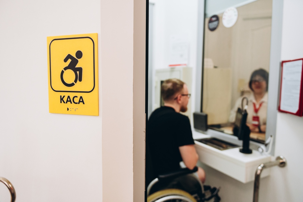 - наявність занижених кас, просторих зон очікування, занижених екранів терміналів для людей на кріслі колісному, щоб кожен міг дістатися та отримати сервіс без бар'єрів.