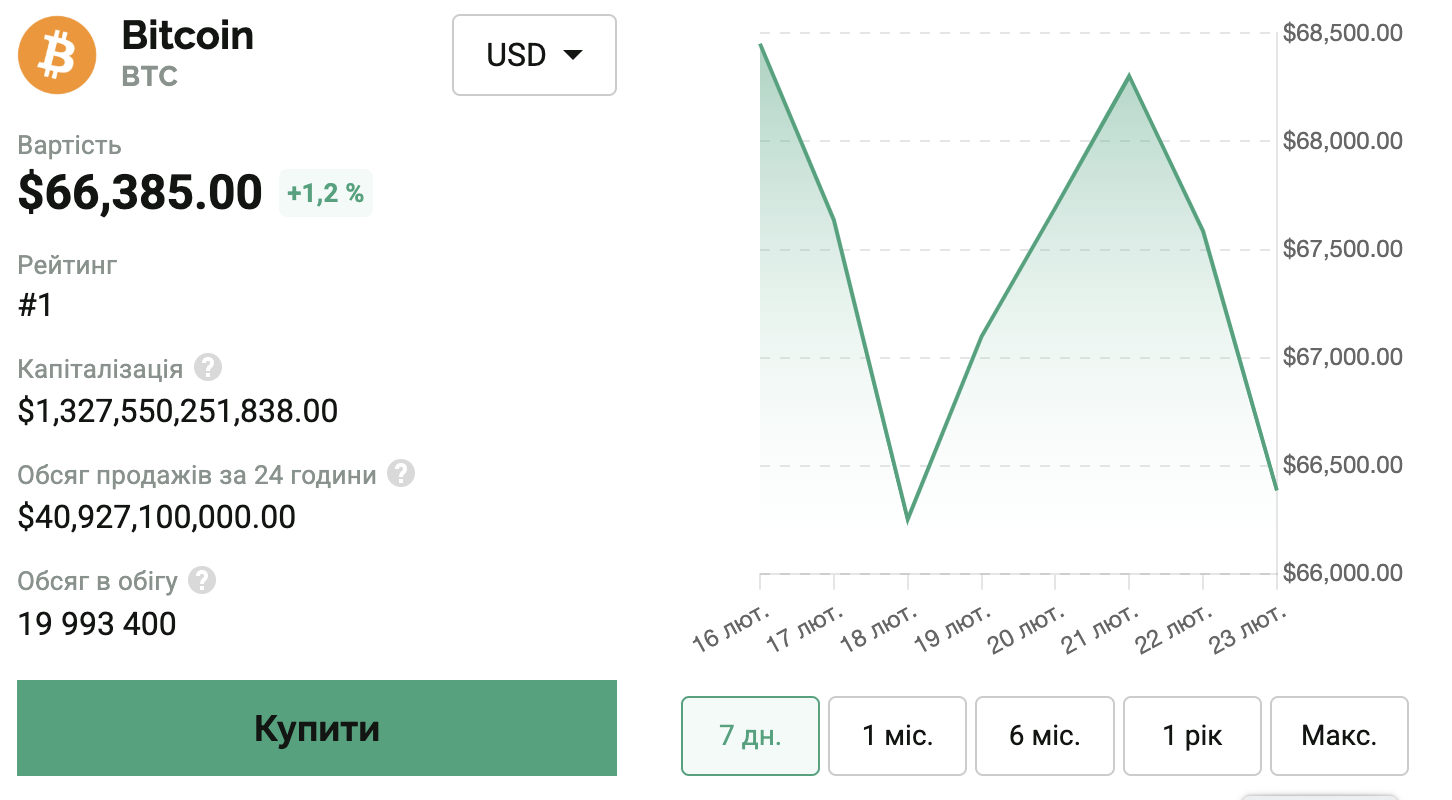Згідно із даними інтерактивної таблиці «Мінфіну», вартість першої криптовалюти станом на 12:25 23 лютого становить $66,385.00.