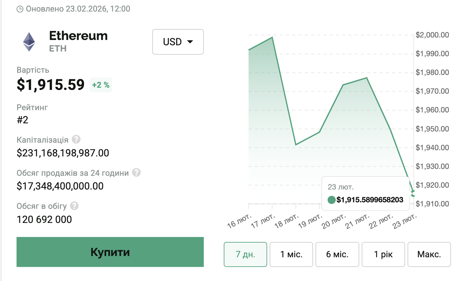 Згідно із даними інтерактивної таблиці «Мінфіну», вартість Ethereum станом на 12:25 становить $1,915.59.