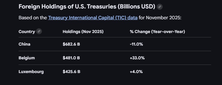 Однак те, що Китай володіє американськими казначейськими облігаціями, не означає, що він повинен мати депозитні активи в США. Подивіться на ту саму таблицю активів і зверніть увагу на Бельгію та Люксембург. У знімку за листопад 2025 року Бельгія показує близько 481 мільярда доларів у казначейських облігаціях, а Люксембург — близько 425 мільярдів доларів. Це величезні суми для дуже маленьких країн, які не створюють резервів такого масштабу.