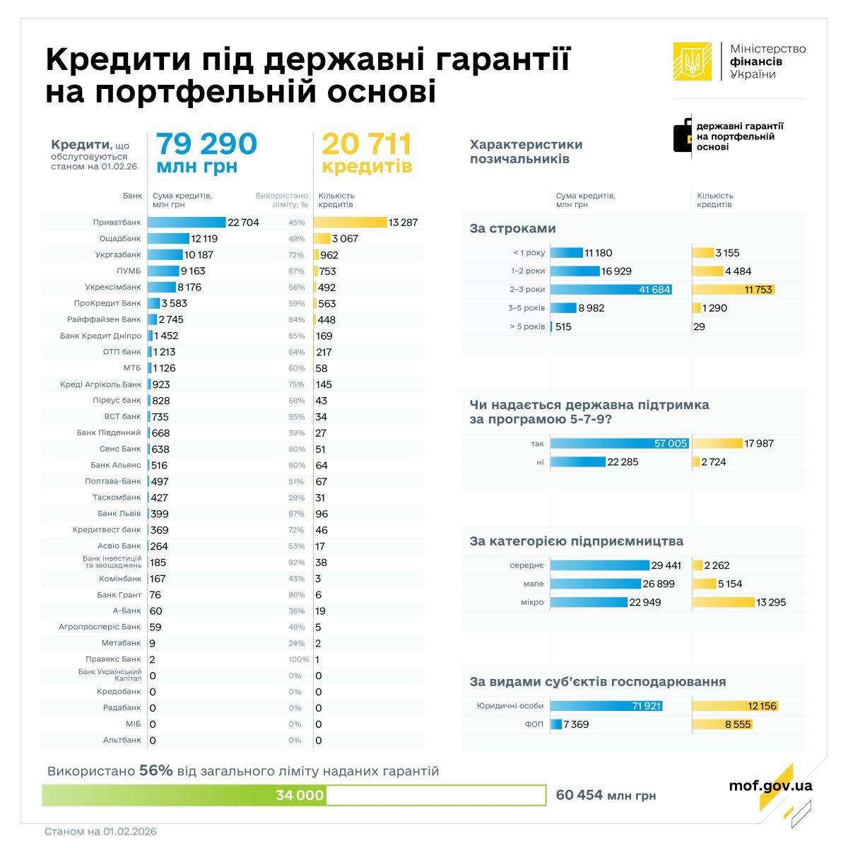 Станом на 1 лютого 2026 року 28 банків-кредиторів обслуговують 20 711 кредитів на суму 79,3 млрд гривень. Зобов’язання за основним боргом, що частково забезпечені державними гарантіями на портфельній основі, становили 34 млрд гривень. Це 56 % від загального ліміту чинних гарантій (60,5 млрд гривень).