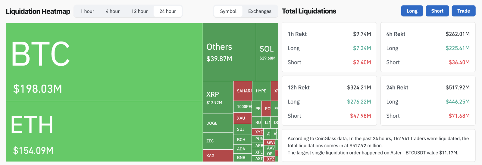 За даними CoinGlass, добовий обсяг ліквідацій за ф’ючерсами на криптоактиви перевищив $517 млн. Унаслідок примусового закриття позицій постраждали понад 152 тисяч трейдерів. Найбільші втрати зафіксовано в операціях із біткоїном та Ethereum. Водночас основна частина ліквідацій припала на довгі позиції.