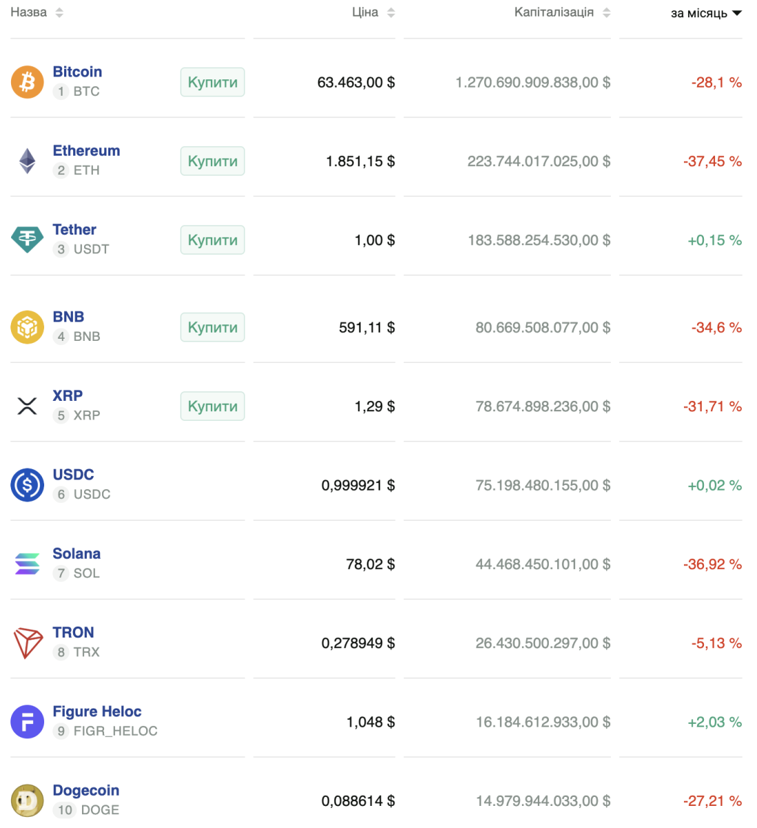 На момент написання новини ціна біткоїна обвалилася до $63 463. За добу актив втратив 6,59%. Інші криптовалюти з найбільшою капіталізацією також продемонсотрували падіння.