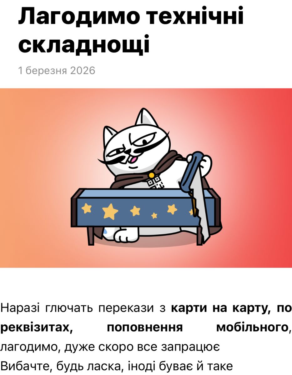 У неділю, 1 березня, у застосунку monobank стався збій. Наразі непрацюють базові операції. Про це повідомляється у застосунку банку.
