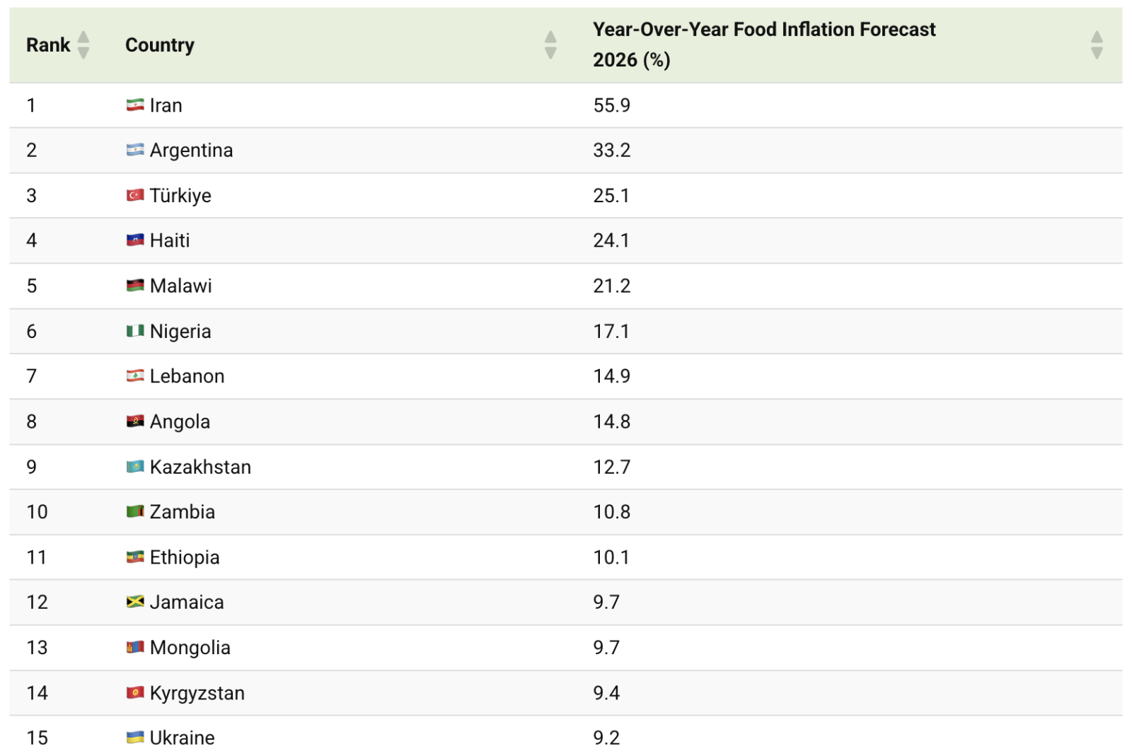 Найбільший стрибок очікується в Ірані — +55,9% за рік. Висока інфляція та тиск на національну валюту продовжують суттєво впливати на вартість продуктів у країні. До трійки також увійшли Аргентина (+33,2%) та Туреччина (+25,1%), де багаторічні інфляційні тенденції залишаються визначальним фактором цінової динаміки.