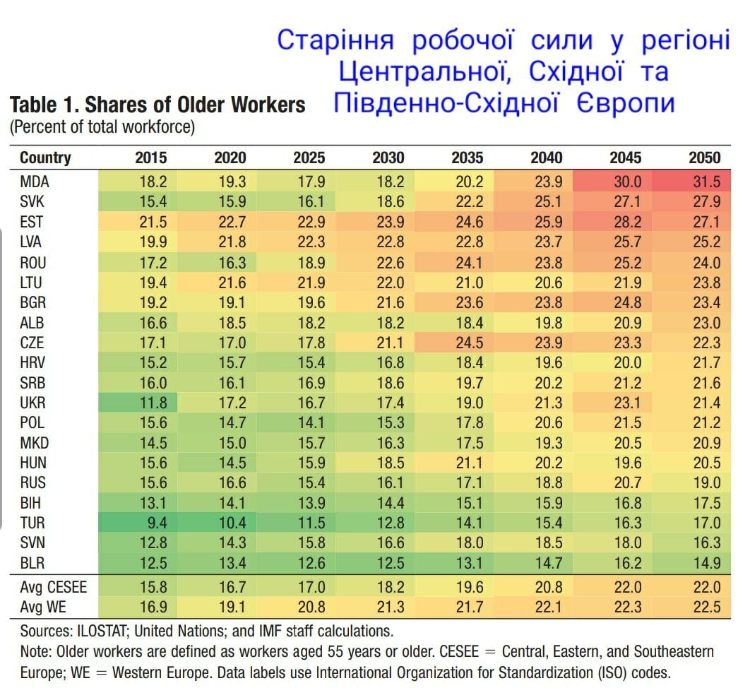 Фахівці МВФ дуже змістовно вивчили це та інші суміжні питання, відправною точкою яких є старіння трудових ресурсів в країнах Центральної та Східної Європи та Балтії, сформувавши у 2019 році прогноз до 2050 року.