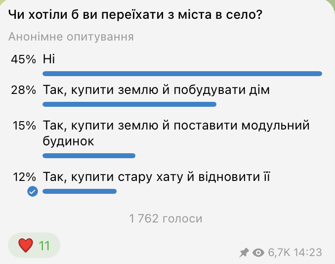 Понад половина опитаних — 55% — готові розглянути переїзд із міста до сільської місцевості. Про це свідчать результати анонімного онлайн-опитування в телеграм-каналі «Мінфіну», в якому взяли участь 1 762 респонденти.