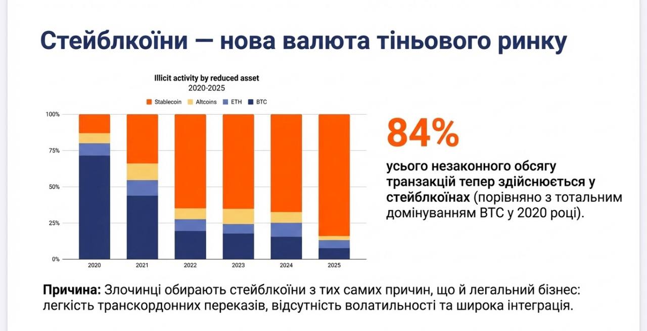 У 2025 році 84% усього незаконного обсягу трансакцій здійснювалася у стейблкоїнах (порівняно з тотальним домінуванням біткоїна в 2020 році). Про це написав заступник голови Податкового комітету