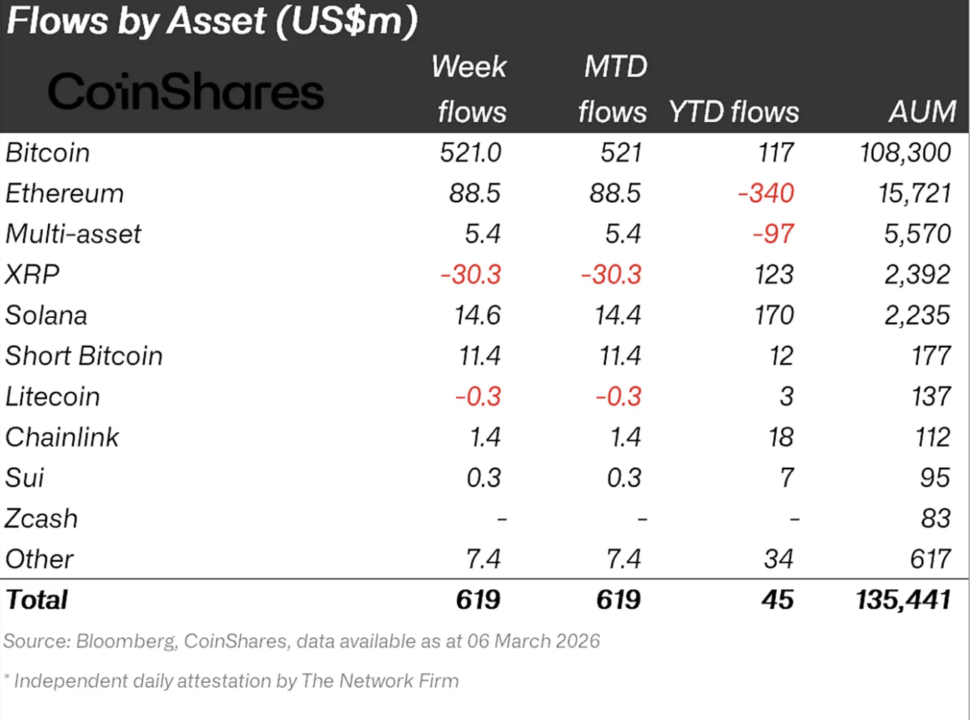 У період з 2 по 6 березня криптовалютні інвестиційні продукти зафіксували чистий притік коштів у розмірі $619 млн. Однак, згідно зі звітом аналітиків CoinShares, динаміка тижня була вкрай неоднорідною.