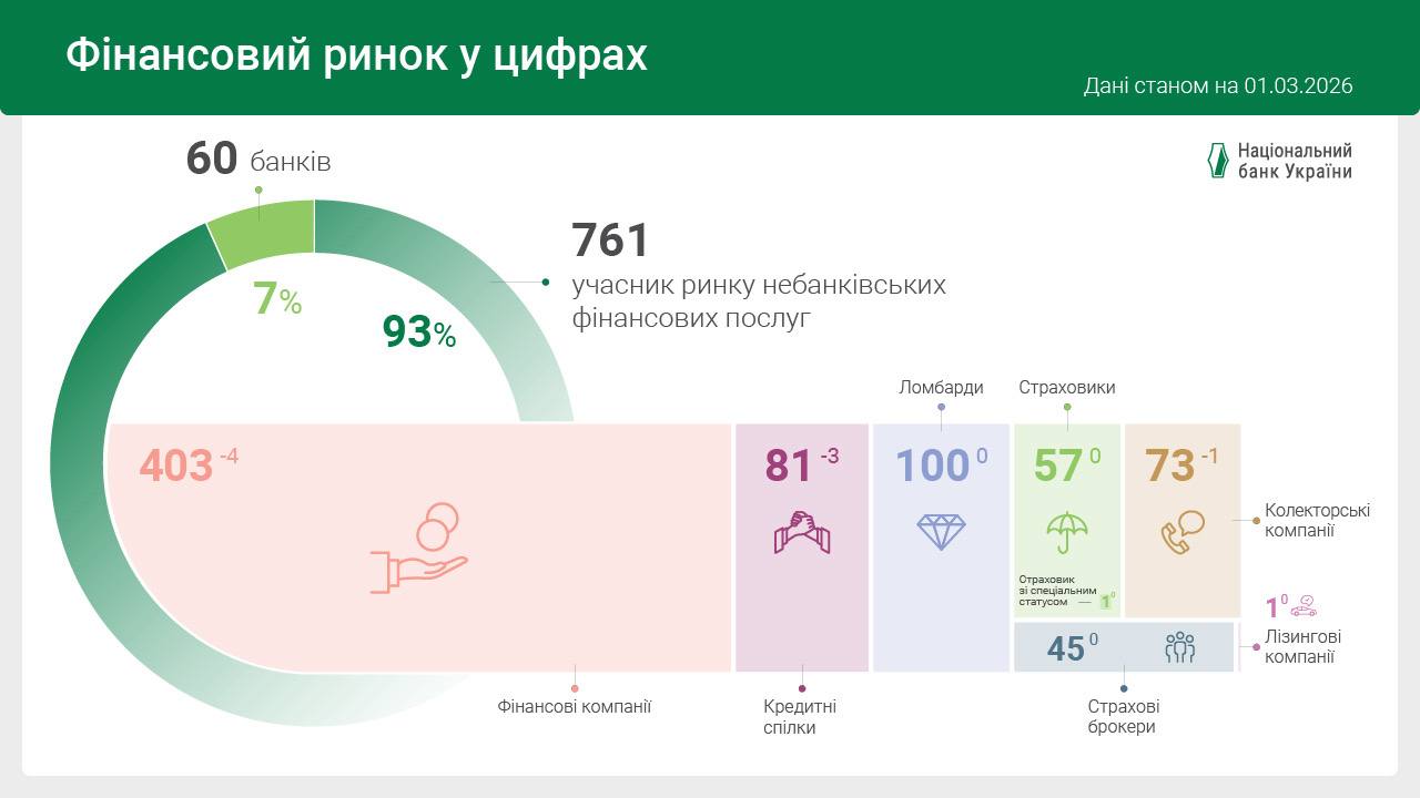 Станом на 1 березня 2026 року на ринку небанківських фінансових послуг працювали:- 403 фінансові компанії (у січні — 407);