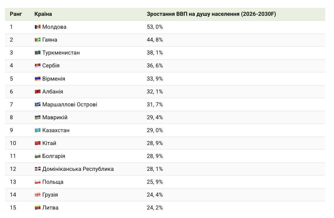 Багато країн із найшвидше зростаючим ВВП на душу населення є країнами з економікою, що розвивається. Молдова лідирує в рейтингу з прогнозованим зростанням на 53% між 2026 і 2030 роками.