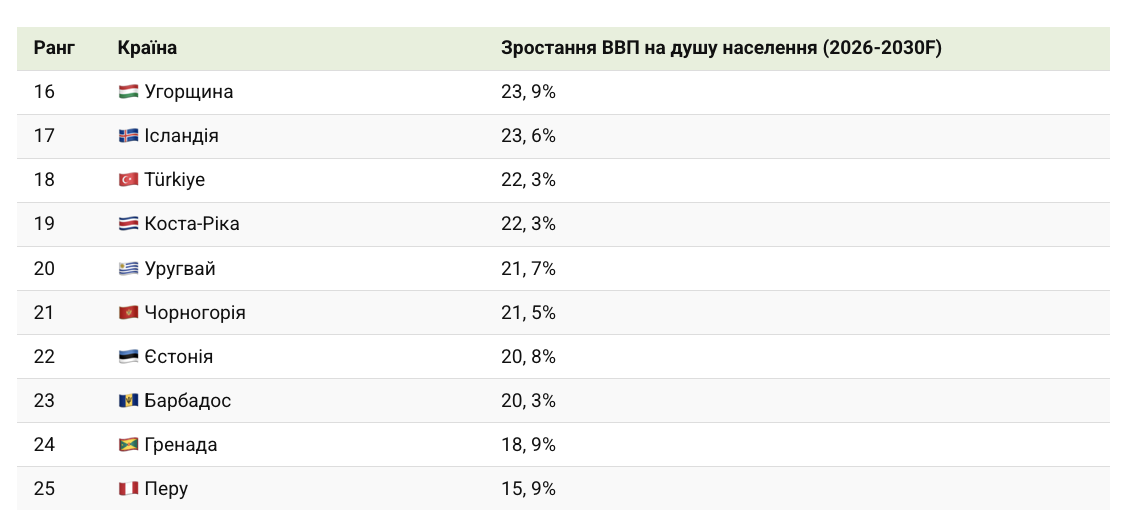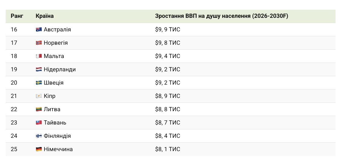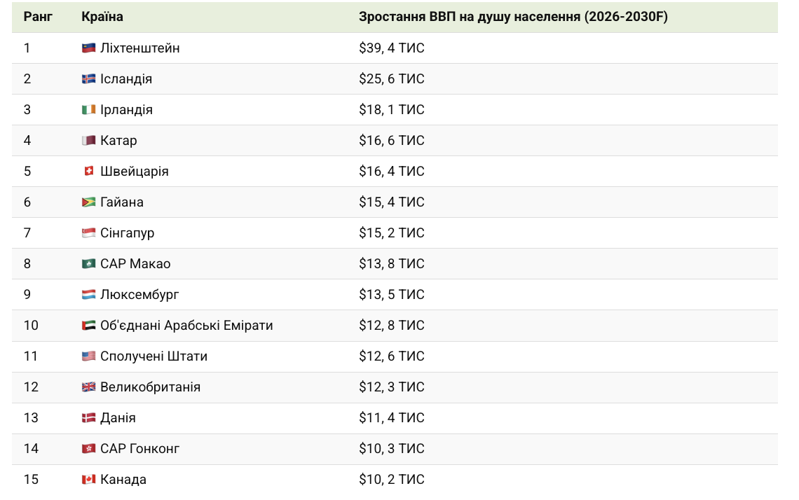 Прогнозується, що такі країни, як Ліхтенштейн, Ісландія, Ірландія та Катар, додадуть десятки тисяч доларів до ВВП на душу населення між 2026 і 2030 роками.