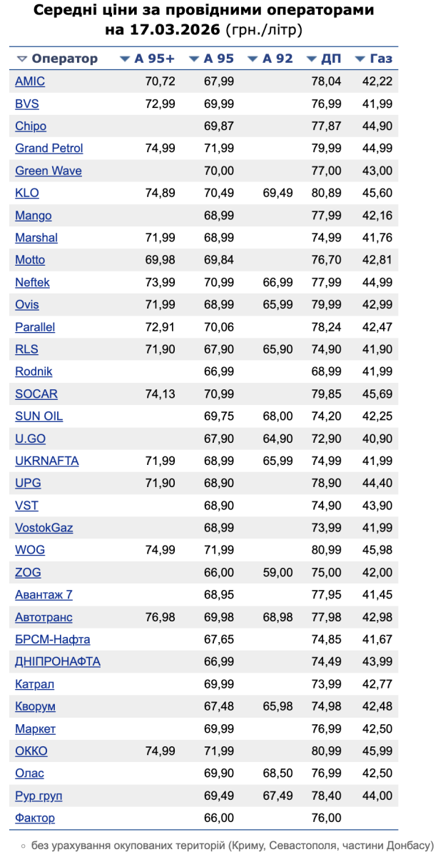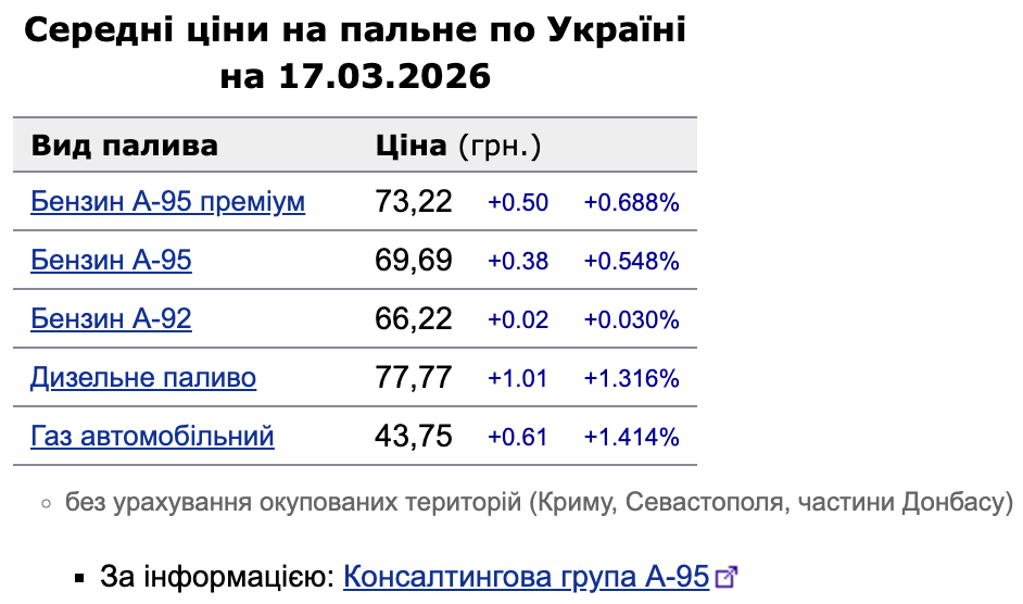 Станом на 17 березня темпи зростання цін на українських заправках значно прискорилися. Порівняно з даними за 13 березня, вартість усіх видів пального помітно зросла, а дизельне паливо продемонструвало найбільший стрибок, наблизившись до психологічної позначки у 80 грн. Про це повідомляє «Мінфін» із посиланням на дані Консалтингової групи «А-95».