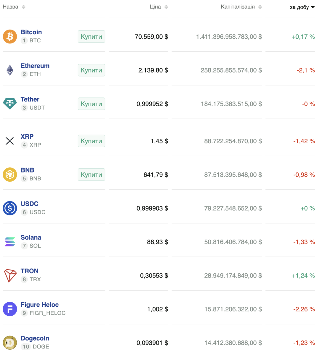 За останні 24 години ціна біткоїна майже не змінилася. Перша криптовалюта наразі торгується в районі $70 560. Ethereum знизився на 2% до $2 140. Інші монети з першої десятки за капіталізацією також опинилися у ««червоній» зоні, крім TRON (+1,24%).