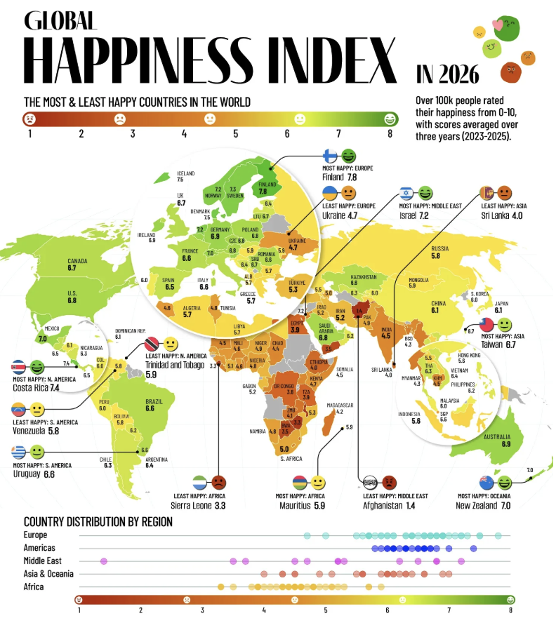 Згідно зі Всесвітнім звітом про щастя 2026 року, Фінляндія знову очолює світовий рейтинг щастя. Але окрім звичного скандинавського домінування, цьогорічні рейтинги містять кілька вражаючих сюрпризів, про це йдеться в рейтингу Visualcapitalist.