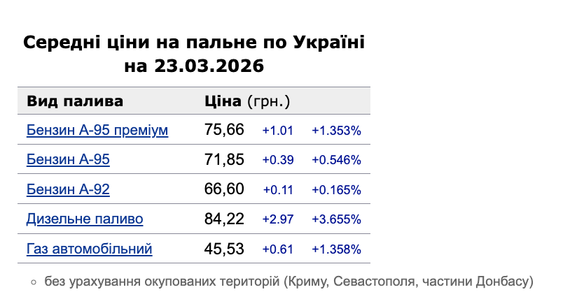 23 березня зафіксовано такі середні ціни на пальне: бензин марки А-95 (преміум) — 75,66 грн/л (здорожчав на 1 грн 01 коп.); бензин марки А-95 — 71,85 грн/л (здорожчав на 39 коп.); бензин марки А-92 — 66,6 грн/л (здорожчав на 11 коп.), дизпальне — 84,22 грн/л (здорожчало на 2 грн 97 коп).