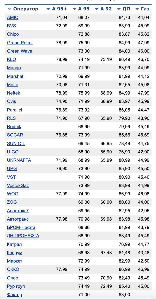 Ціни АЗС на пальне та автогаз