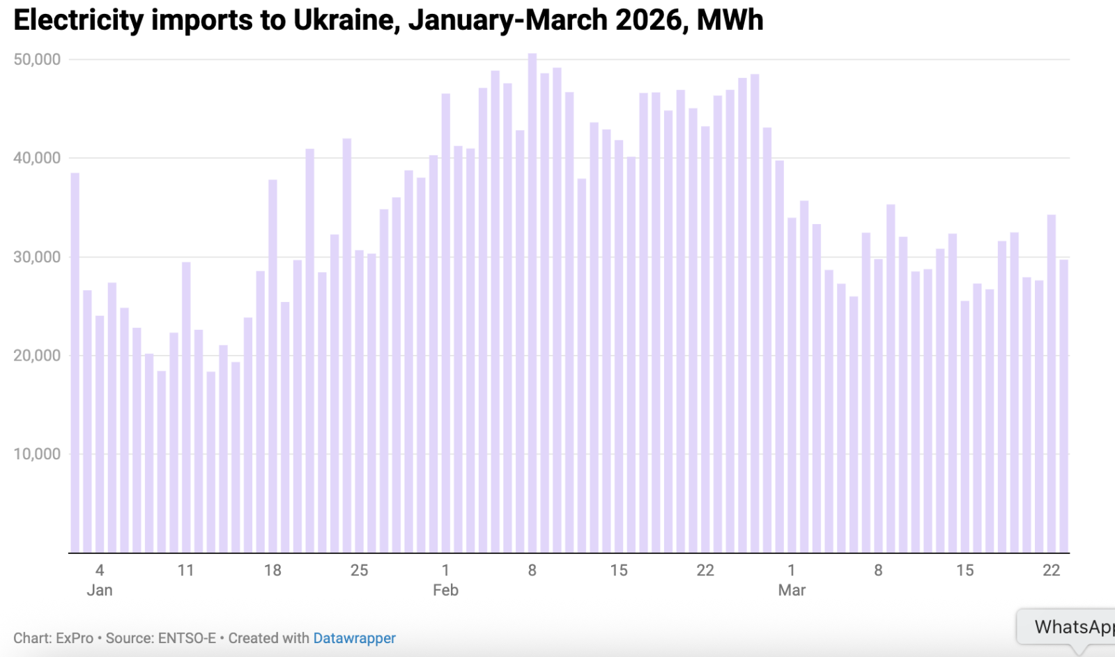 В середньому у березні 2026 року Україна імпортує 30 тис. МВт-год на добу. Для порівняння у березні 2025 року середній добовий імпорт становив 8,3 тис. МВт-год.