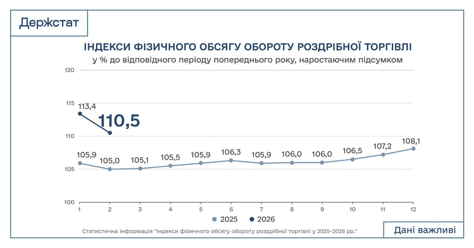 За даними Державної служби статистики, оборот роздрібної торгівлі в січні-лютому 2026 року відносно аналогічного періоду минулого року зріс на 10,5%. У лютому 2026 року до лютого 2025 року — на 7,5%.