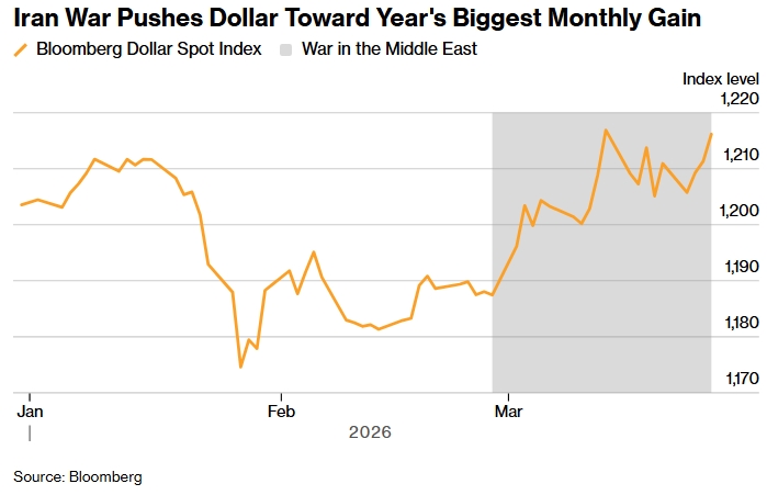 У березні індекс долара Bloomberg зріс більш ніж на 2% завдяки попиту на захисні активи та перегляду очікувань щодо політики ФРС після стрибка цін на енергоносії.