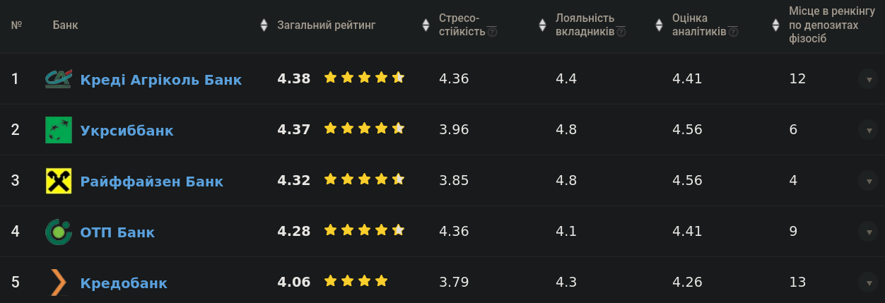 У першу п'ятірку найстійкіших банків входять також ОТП Банк та Кредобанк.