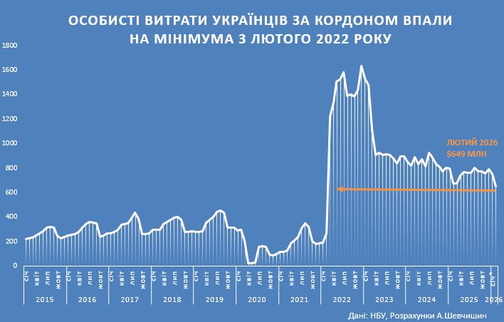 Витрати українців за кордоном у лютому 2026 року впали до мінімуму з початку повномасштабної війни — $649 млн. Про це написав фінансовий аналітик Андрій Шевчишин.