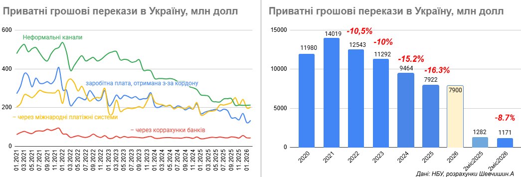 За 2 місяці 2026 року приватні грошові перекази в Україну впали на 8,7% до $1,17 млрд. Це мінімальні рівні переказів за 9 років. Про це написав фінансовий аналітик Андрій Шевченко.