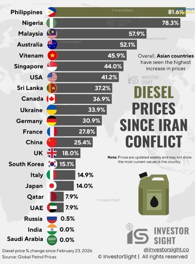 Побачив цікаву інфографіку про темпи зростання цін на дизпальне. Щоправда, дещо дивний спосіб порівняння обрали автори — у відсотках.