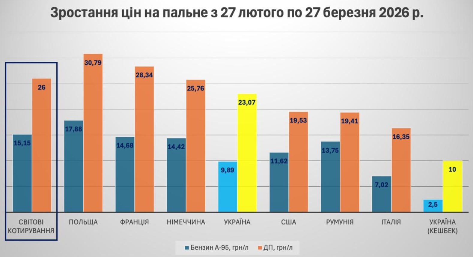 Наприклад, дизпальне у Польщі і Штатах подорожчало однаково — на 45%, але в гривнях різниця у півтора рази! Американцям доводиться тепер платити на 19,53 грн дорожче, а полякам — на 30,80!