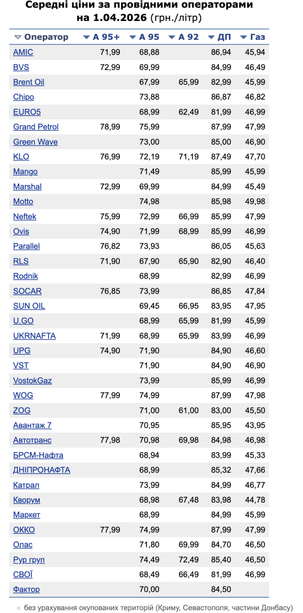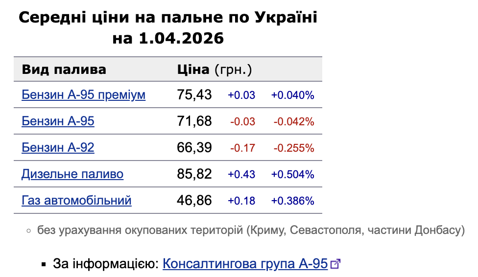 Ціни на АЗС 1 квітня: дизель та автогаз продовжують дорожчати, А-92 демонструє найбільше падіння