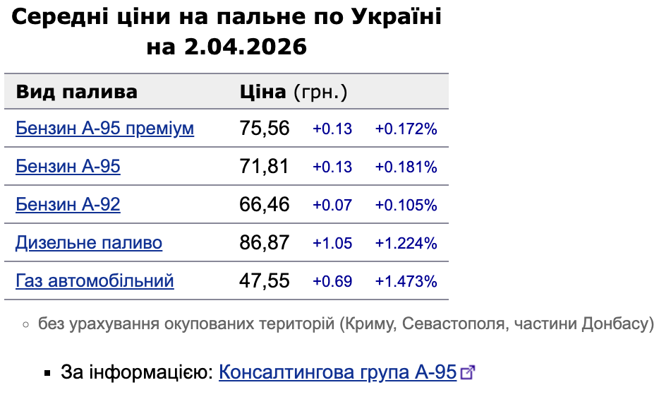 Бензин А-95 та А-95 преміум: обидва види пального подорожчали однаково — на 13 копійок. Середня ціна на «п'ятірку» становить 71,81 грн/л, а на преміальну версію — 75,56 грн/л.