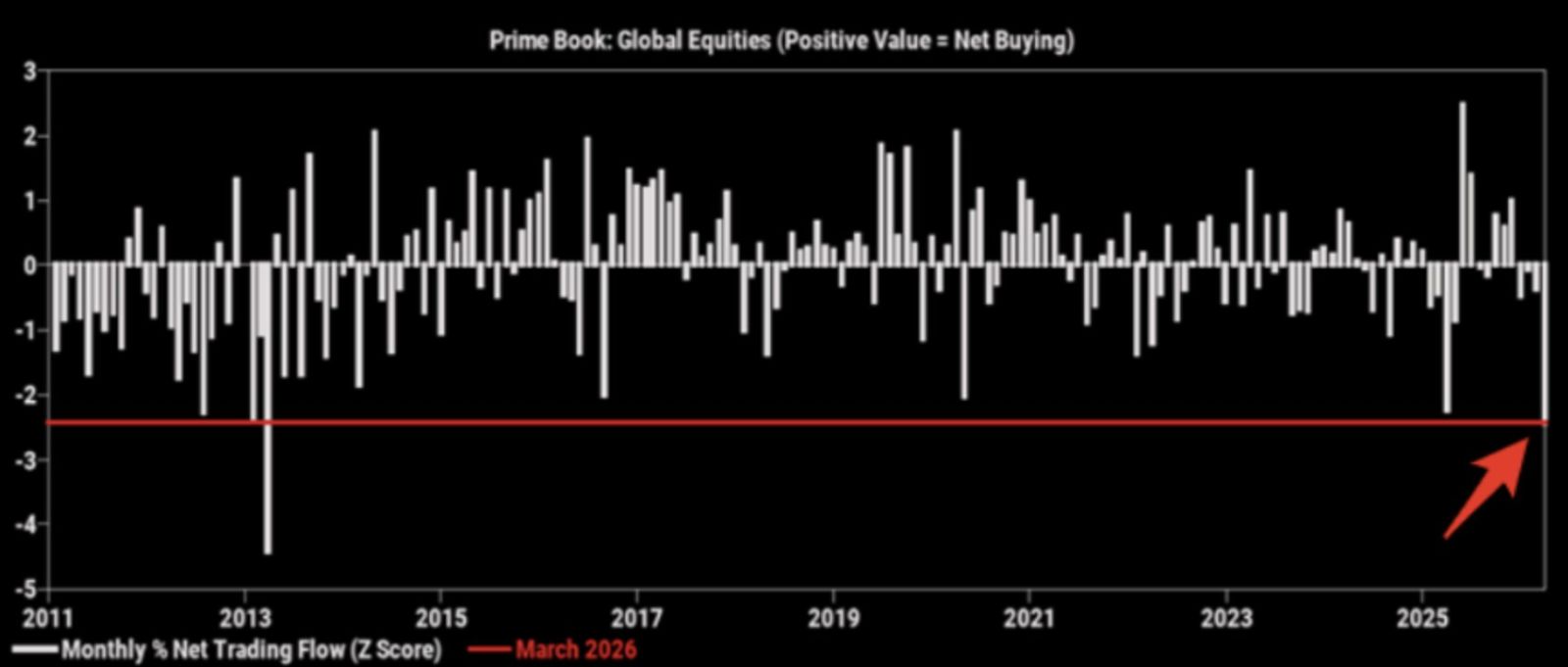 Згідно з даними індикатора Prime Book, який відстежує рух глобальних акцій (де позитивне значення означає чисту купівлю, а негативне — чистий продаж), на початку весни 2026 року ринок зіткнувся з безпрецедентним відтоком капіталу. Щомісячний відсоток чистого торгового потоку, який вимірюється за шкалою від -5 до 3, продемонстрував стрімке падіння.