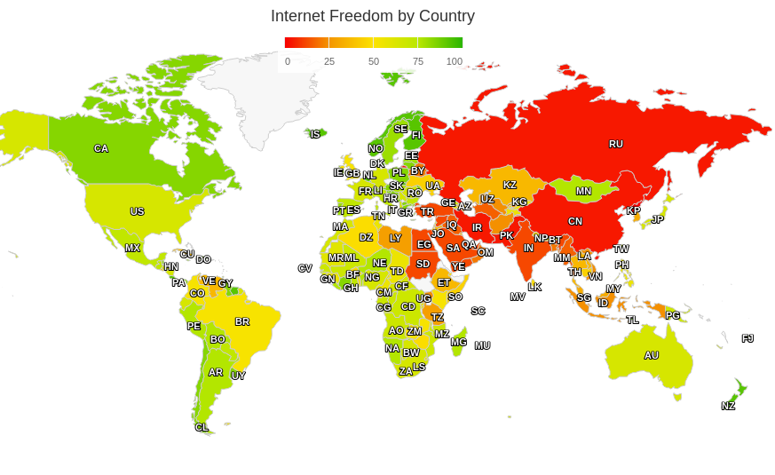 Найгіршу ситуацію зі свободою в інтернеті очікувано демонструє Північна Корея, яка отримала 0 балів — доступ до глобальної мережі там має виключно лояльна до режиму верхівка. росія, Пакистан, Іран та Китай розділили передостанні позиції, набравши лише по 4 бали. Загалом країни з найнижчими показниками (20 балів і менше) географічно розподілені на трьох континентах: в Азії, Африці та Європі.