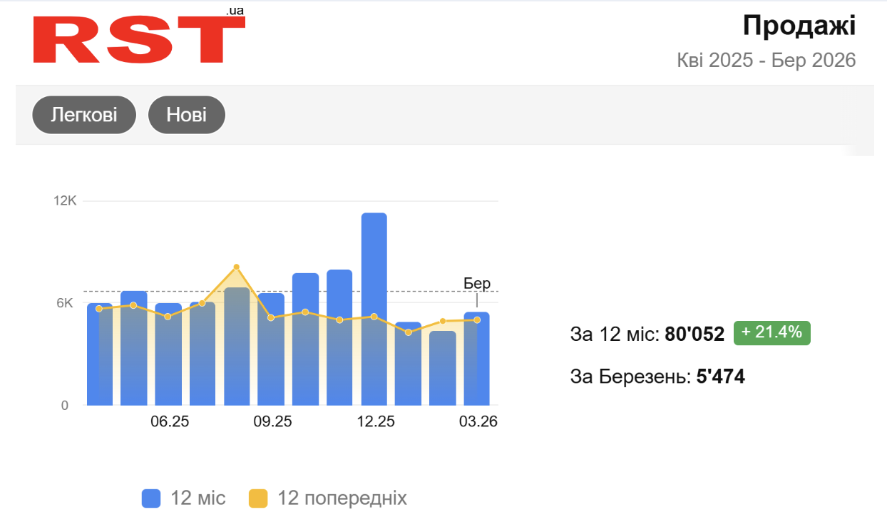 У березні 2026 року ринок нових легкових автомобілів в Україні продемонстрував перші ознаки відновлення після слабкого старту року. Обсяг реєстрацій зріс на 9% у річному вимірі. Загалом за останні 12 місяців ринок нових авто збільшився на 21%. За даними RST.