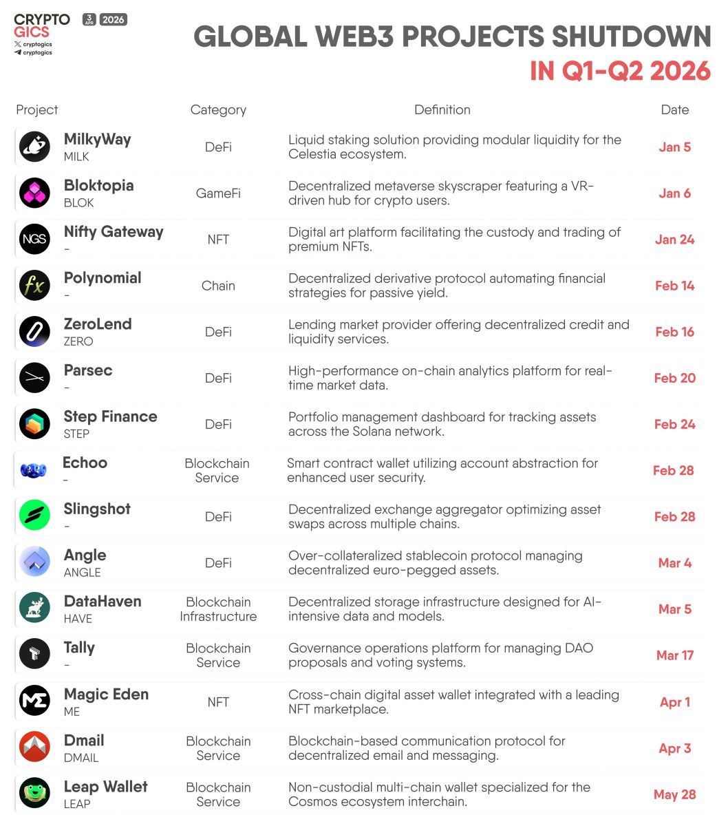 Ринок децентралізованих технологій проходить через етап жорсткої консолідації. Згідно з даними моніторингу Cryptogics, за перші чотири місяці 2026 року про припинення роботи оголосила низка відомих проєктів у секторах DeFi, NFT та блокчейн-сервісів.