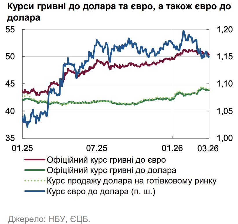 У березні 2026 року український валютний ринок відчув вплив глобальних фінансових трендів. Гривня дещо послабилася до долара, проте показала стійкість щодо євро, зберігаючи стабільність готівкового ринку. Про це йдеться у свіжому Макроекономічному та монетарному огляді НБУ.