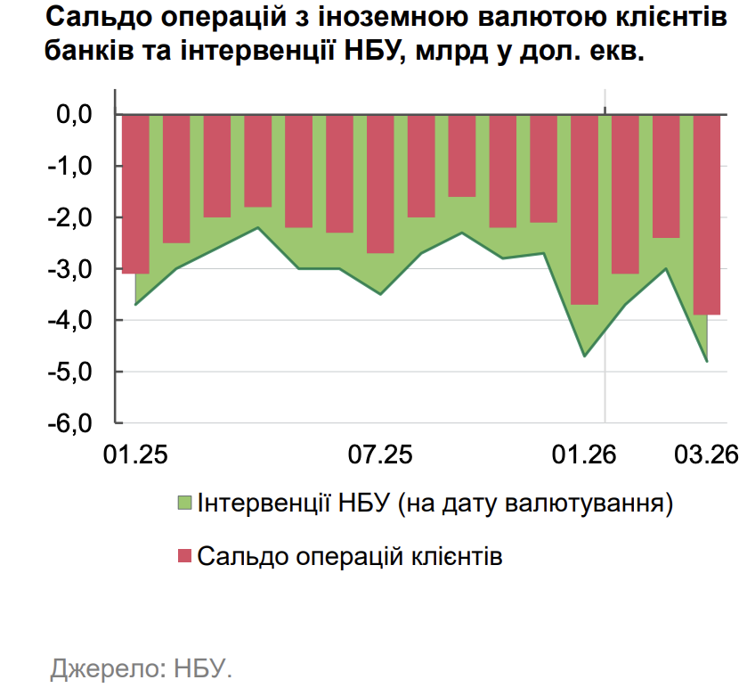 «Мінфін» писав, що у березні 2026 року обсяг валютних інтервенцій Національного банку сягнув $4,767 млрд, що є найвищим показником з грудня 2024 року (коли було зафіксовано історичний максимум у $5,2 млрд).