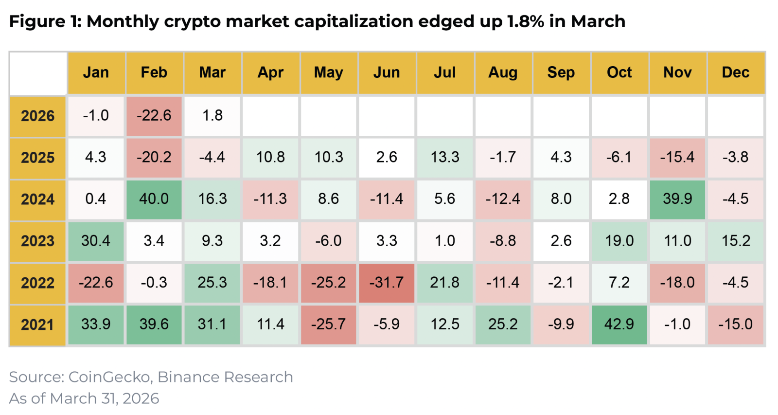 У березні крипторинок зріс на 1,8%, спотові біткоїн-ETF повернулися до чистих притоків — Binance Research