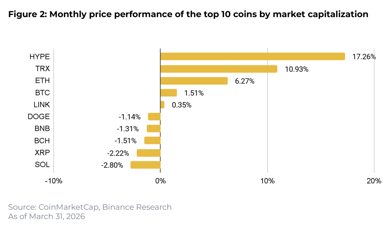 Березень пройшов під впливом конфлікту між США та Іраном. Через збої у світовій торгівлі нафтою Brent подорожчала на 36%, індекс волатильності VIX у піку сягнув 35, індекс S&P 500 знизився на 5,3%, золото — на 14,1%, а дохідність 10-річних державних облігацій США зросла на 46 базисних пунктів до 4,32%. На цьому тлі Bitcoin і Ethereum додали 1,51% і 6,27% відповідно.
