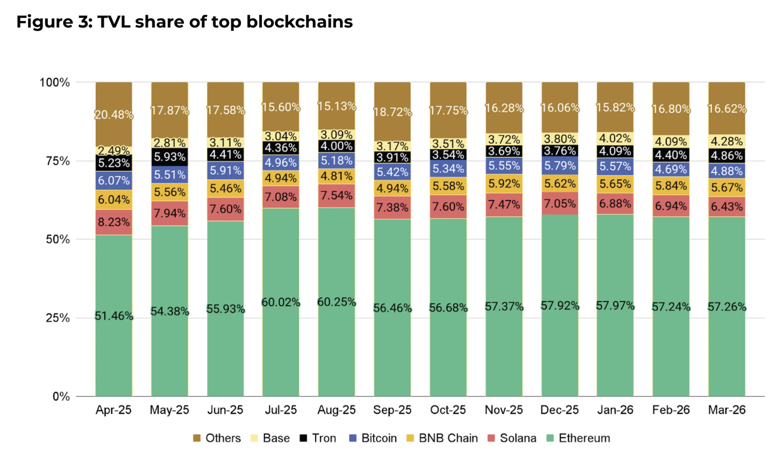 У березні сукупна заблокована вартість активів у децентралізованих фінансах (Total Value Locked, TVL) знизилася до $92,83 млрд або на 3,3% порівняно з попереднім місяцем. Серед п’яти найбільших екосистем Ethereum, BNB Chain і Base трохи наростили свою частку, але загальна структура ринку майже не змінилася.