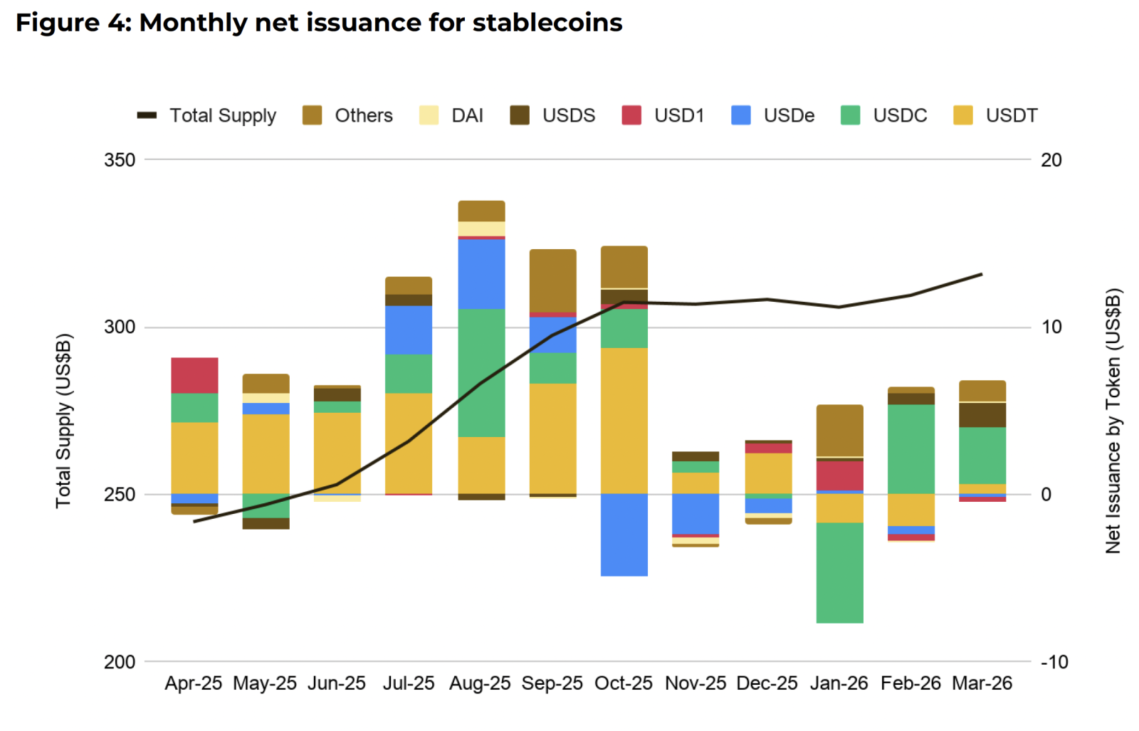 Сукупна пропозиція стейблкоїнів у березні утримувалася біля позначки $315 млрд і зросла на 0,11% порівняно з попереднім місяцем. Тиск на сегмент створив новий драфт U.S. Clarity Act, який передбачає обмеження на дохідність і винагороди за пасивне утримання стейблкоїнів. На цьому тлі акції CRCL протягом дня втрачали близько 20%. Додатковим фактором стала заява Tether про аудит однією з компаній Big 4.