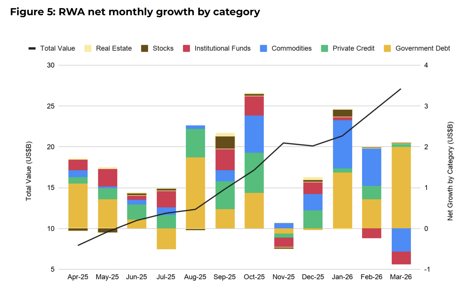 Сегмент токенізованих реальних активів (Real-World Assets, RWA) зріс до приблизно $27,1 млрд або майже на 4% за місяць. Основний внесок дав сегмент державного боргу, який залучив близько $2 млрд. Натомість сегменти товарів та інституційних фондів показали сукупний відтік на рівні близько $0,9 млрд.