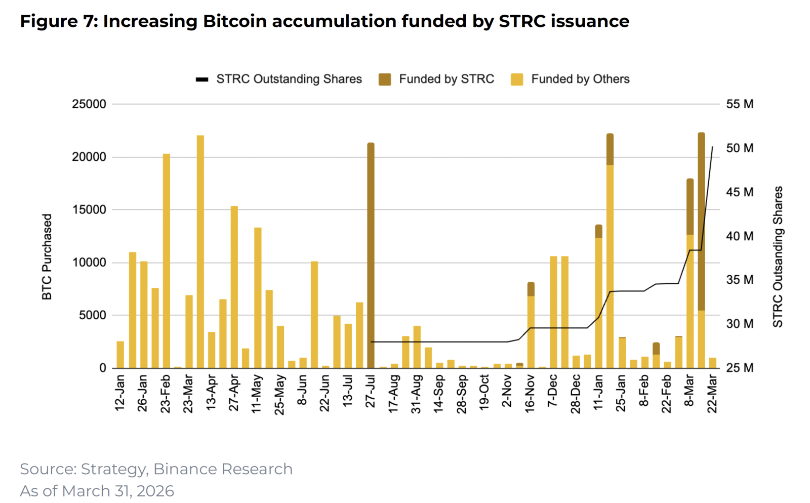 Від початку 2026 року вона купила майже 90 тис. BTC на суму близько $7,25 млрд — це 40% від її річного обсягу покупок у 2025 році і в 10 разів більше, ніж під час ведмежого ринку 2022 року. Попит на STRC додатково підтримують дохідність понад 11% і вищий пріоритет цих акцій порівняно з MSTR. У березні обсяг торгів STRC сягнув рекордних $4,35 млрд, що на 95% більше, ніж місяцем раніше.