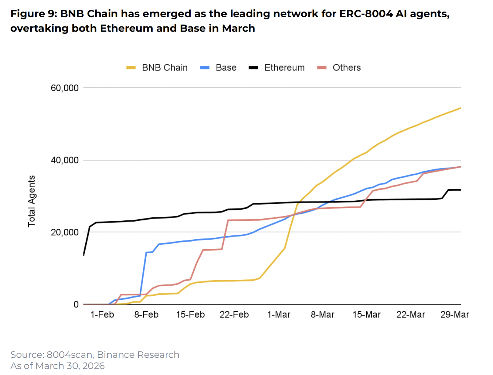 Четвертий сигнал — ринок швидко вибудовує базову інфраструктуру для ШІ-агентів. Запущений 29 січня стандарт ERC-8004, який дає таким агентам ончейн-ідентичність, менш ніж за два місяці зріс із 337 до понад 162 тис. зареєстрованих агентів у 22 мережах. Найбільша частка — у BNB Chain: 54 467 агентів, або 33,5% від загальної кількості. Далі йдуть Base — 38 170 (23,5%) та Ethereum — 31 767 (19,5%).