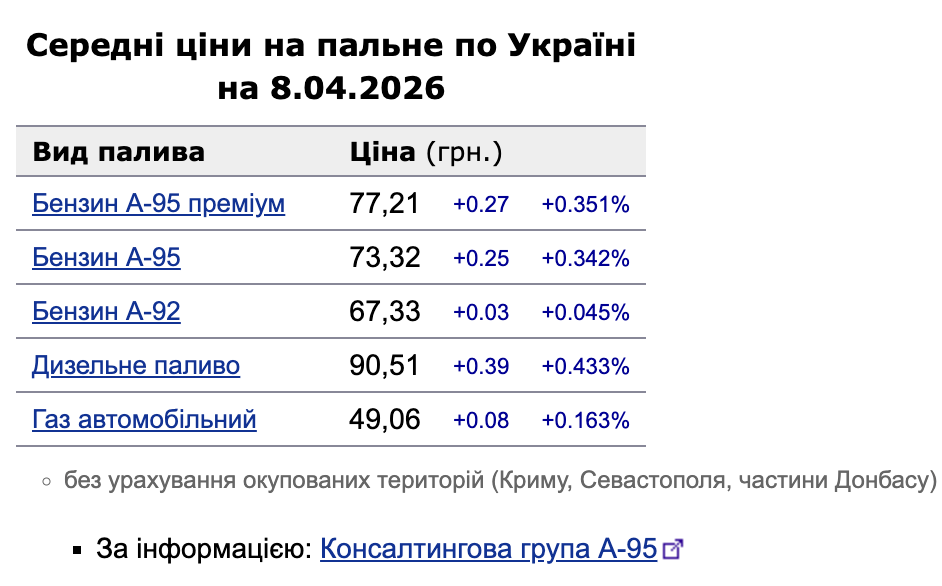 - Бензин А-95 також показує активну динаміку зростання. Вартість літра збільшилася на 25 копійок і становить 73,32 грн.