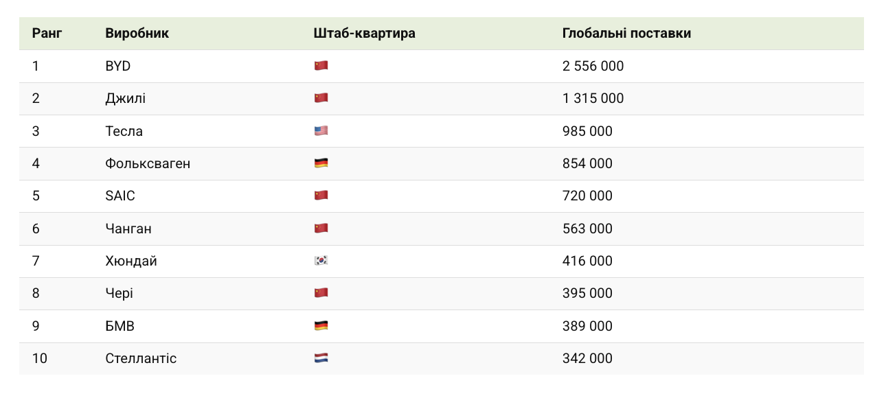 BYD окремо стоїть на вершині, постачаючи понад 2,5 мільйона електромобілів за цей період. Geely посідає друге місце, а Tesla — третє, що показує, що глобальні перегони електромобілів більше не є змаганням двох гігантів.